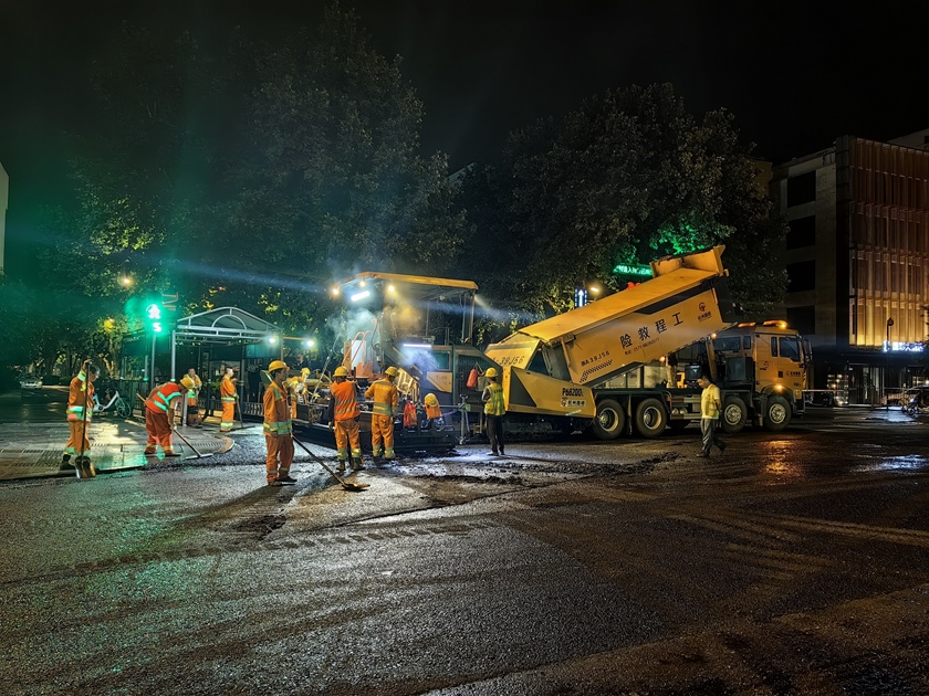 作為重要的東向西道路,環(huán)北天目工程現(xiàn)狀交通壓力大,交通導改難度高,道路瀝青面層攤鋪施工多安排在凌晨開展。